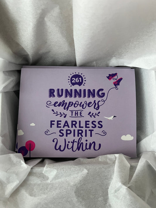 Proudly show that you support empowering women runners through 261 Fearless with these beautiful items: notebooks, pop sockets, tote bags, bracelets and more.